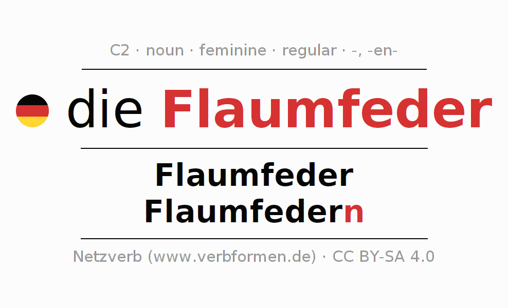 - Singular: die Flaumfeder, der Flaumfeder, der Flaumfeder, die Flaumfeder