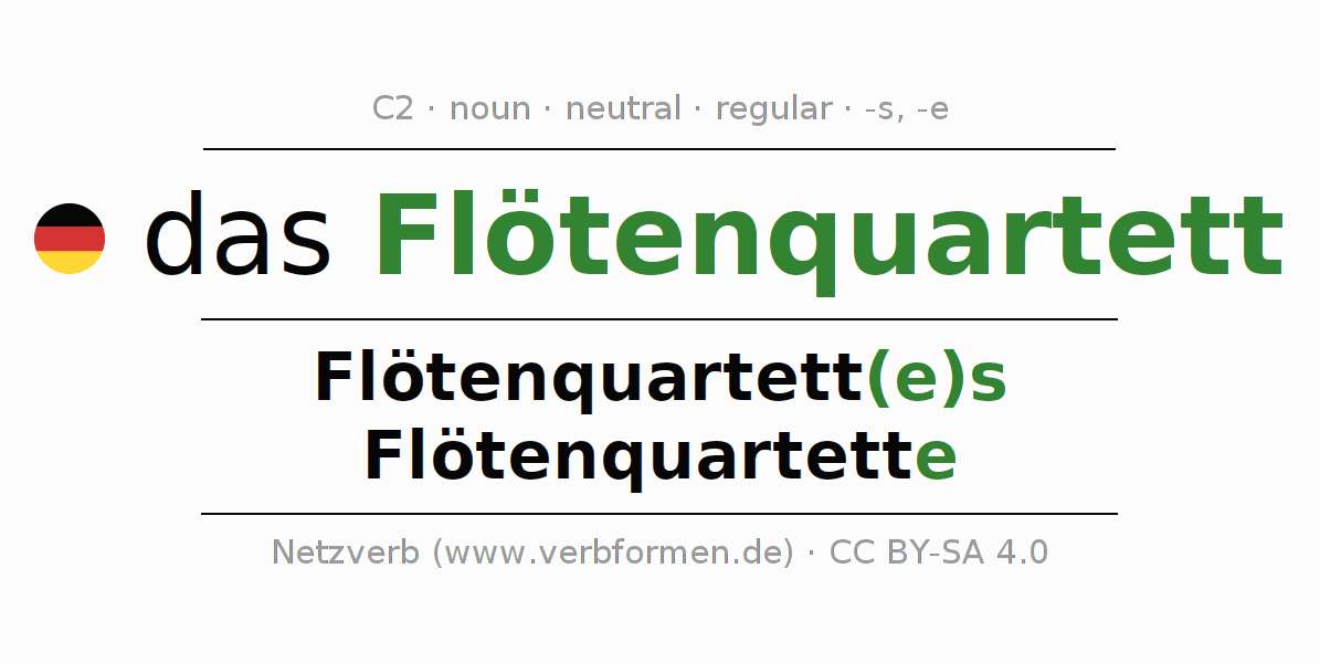 The declension of Flötenquartett as a table with all forms in singular (singular) and plural (plural) and in all four cases nominative (1st case), genitive (2nd case), dative (3rd case) and accusative (4th case). Especially for German learners the correct declension of the word Flötenquartett is crucial.
