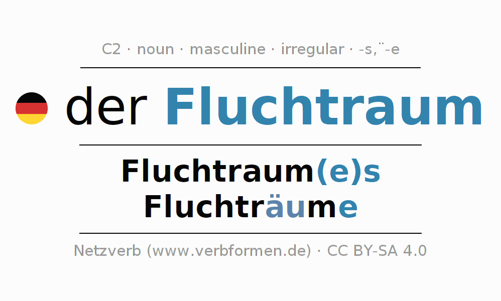 The declension of Fluchtraum as a table with all forms in singular (singular) and plural (plural) and in all four cases nominative (1st case), genitive (2nd case), dative (3rd case) and accusative (4th case). Especially for German learners the correct declension of the word Fluchtraum is crucial.