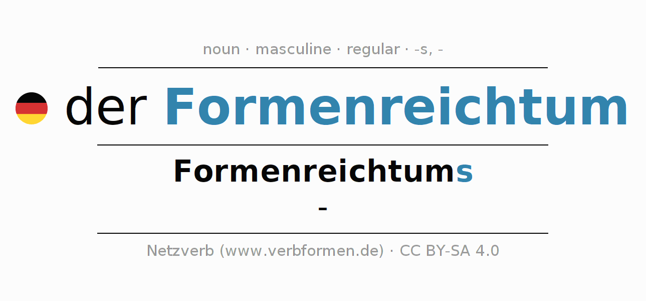 - Singular: der Formenreichtum, des Formenreichtums, dem Formenreichtum, den Formenreichtum