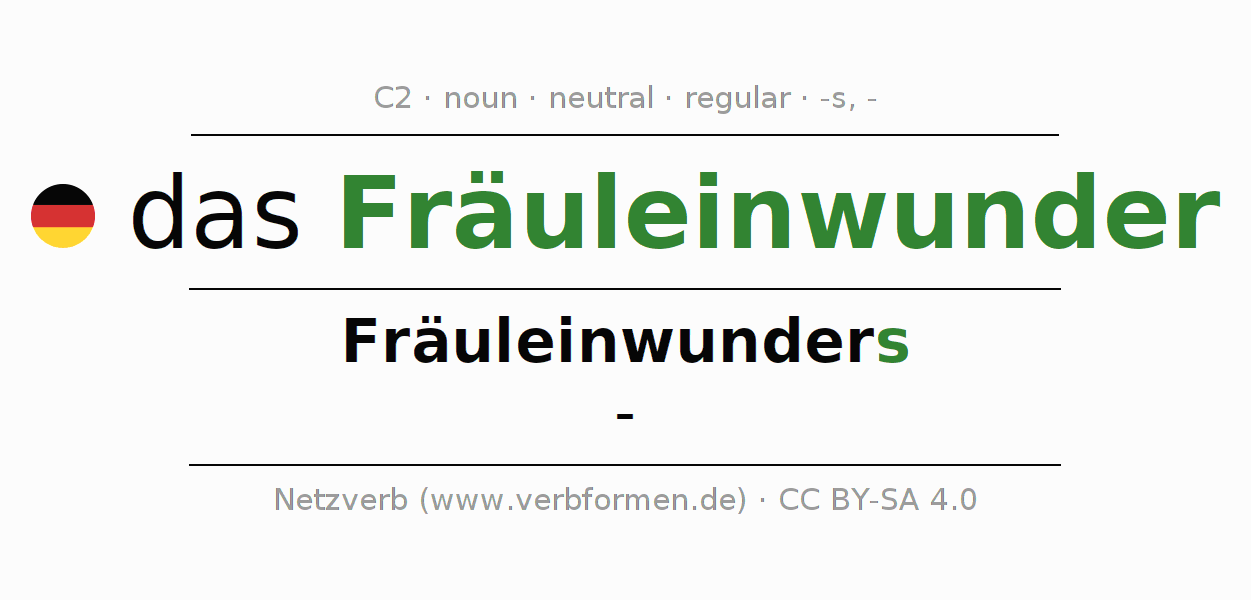 The declension of Fräuleinwunder as a table with all forms in singular (singular) and plural (plural) and in all four cases nominative (1st case), genitive (2nd case), dative (3rd case) and accusative (4th case). Especially for German learners the correct declension of the word Fräuleinwunder is crucial.