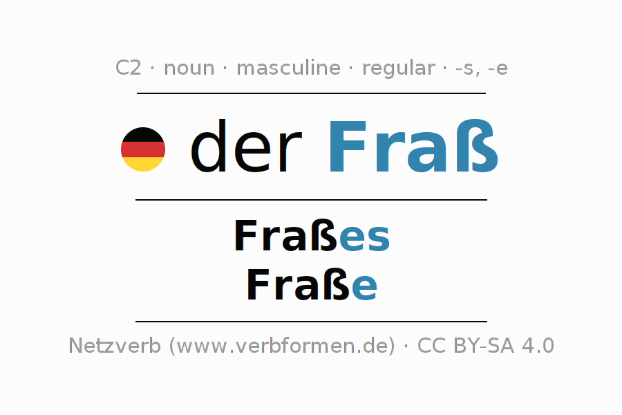 The declension of Fraß as a table with all forms in singular (singular) and plural (plural) and in all four cases nominative (1st case), genitive (2nd case), dative (3rd case) and accusative (4th case). Especially for German learners the correct declension of the word Fraß is crucial.