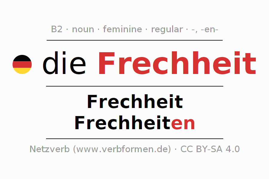 The declension of Frechheit as a table with all forms in singular (singular) and plural (plural) and in all four cases nominative (1st case), genitive (2nd case), dative (3rd case) and accusative (4th case). Especially for German learners the correct declension of the word Frechheit is crucial.