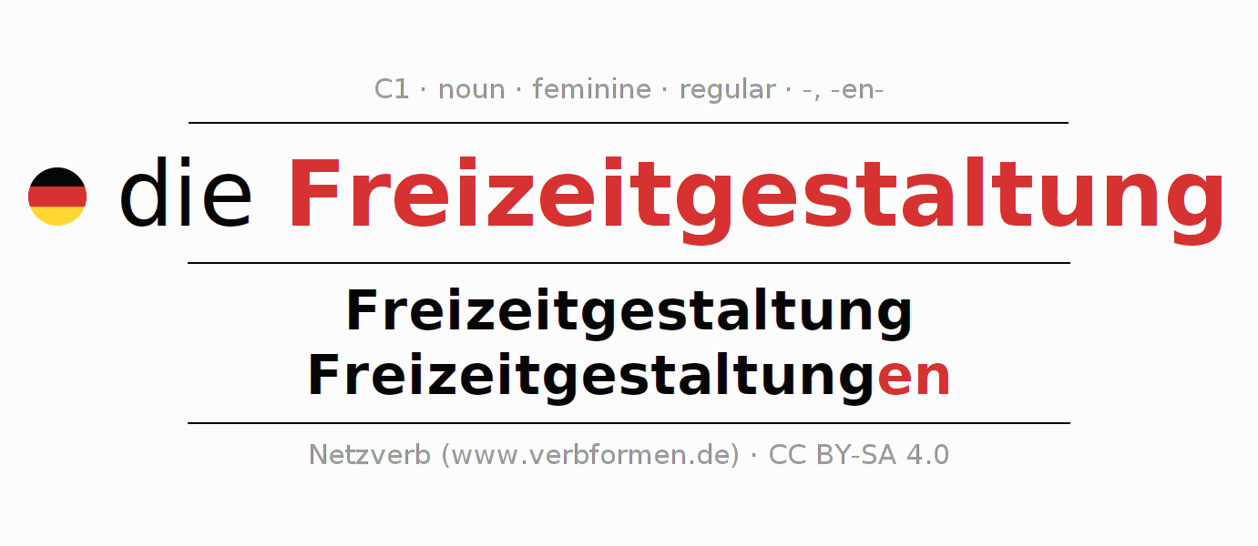 The declension of Freizeitgestaltung as a table with all forms in singular (singular) and plural (plural) and in all four cases nominative (1st case), genitive (2nd case), dative (3rd case) and accusative (4th case). Especially for German learners the correct declension of the word Freizeitgestaltung is crucial.