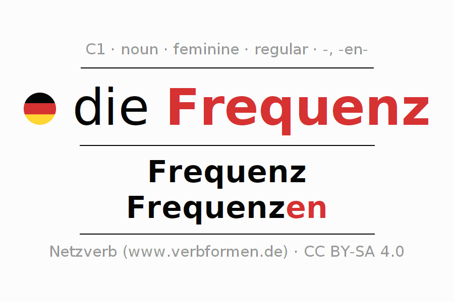 The declension of Frequenz as a table with all forms in singular (singular) and plural (plural) and in all four cases nominative (1st case), genitive (2nd case), dative (3rd case) and accusative (4th case). Especially for German learners the correct declension of the word Frequenz is crucial.