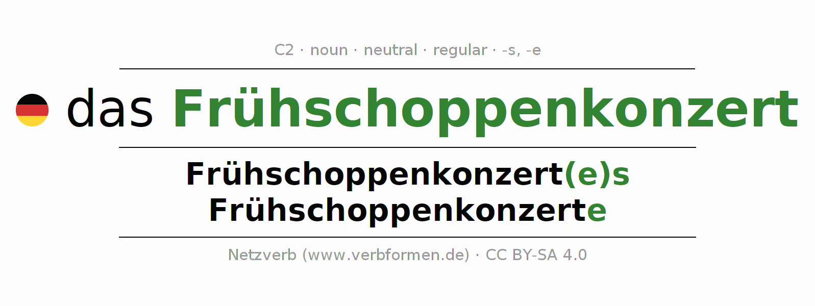 The declension of Frühschoppenkonzert as a table with all forms in singular (singular) and plural (plural) and in all four cases nominative (1st case), genitive (2nd case), dative (3rd case) and accusative (4th case). Especially for German learners the correct declension of the word Frühschoppenkonzert is crucial.