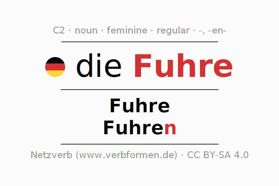 The declension of Fuhre as a table with all forms in singular (singular) and plural (plural) and in all four cases nominative (1st case), genitive (2nd case), dative (3rd case) and accusative (4th case). Especially for German learners the correct declension of the word Fuhre is crucial.