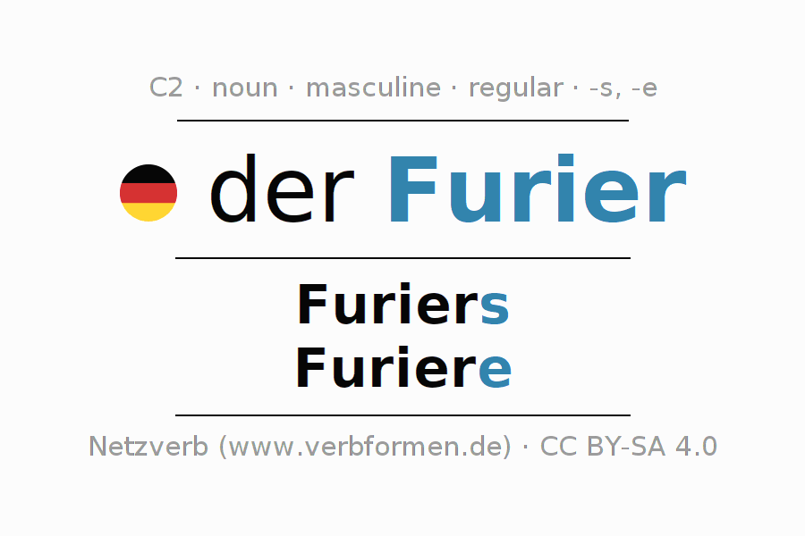 The declension of Furier as a table with all forms in singular (singular) and plural (plural) and in all four cases nominative (1st case), genitive (2nd case), dative (3rd case) and accusative (4th case). Especially for German learners the correct declension of the word Furier is crucial.