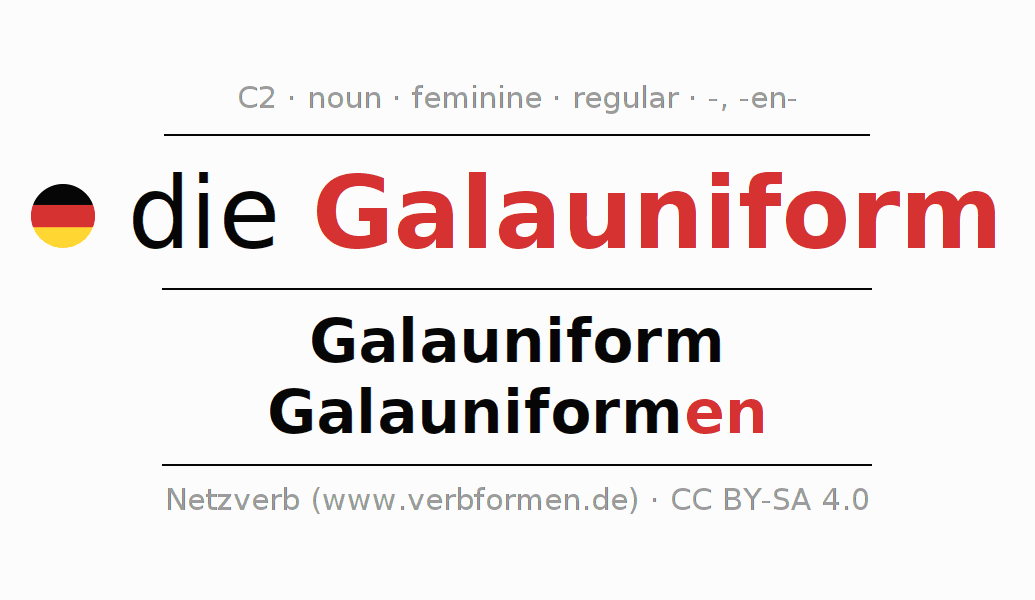 - Plural: die Galauniformen, der Galauniformen, den Galauniformen, die Galauniformen