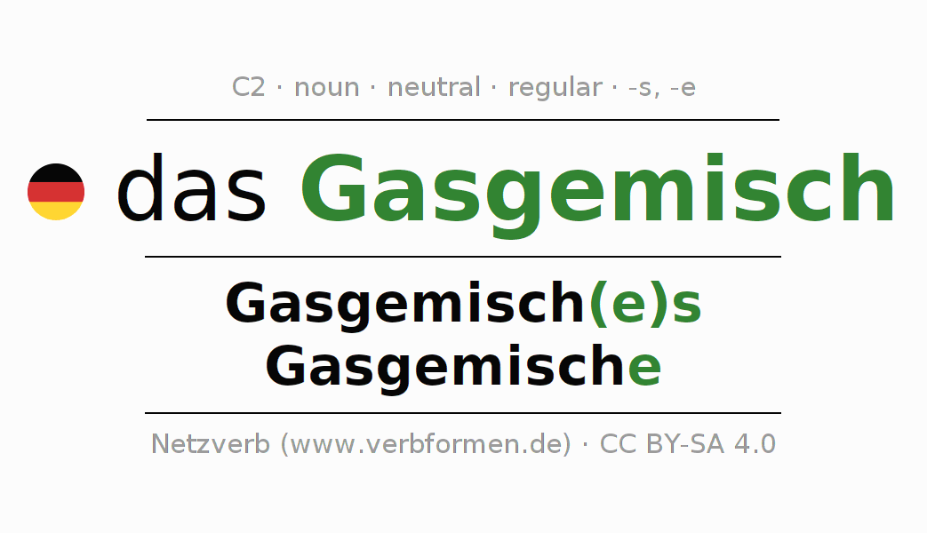 The declension of Gasgemisch as a table with all forms in singular (singular) and plural (plural) and in all four cases nominative (1st case), genitive (2nd case), dative (3rd case) and accusative (4th case). Especially for German learners the correct declension of the word Gasgemisch is crucial.