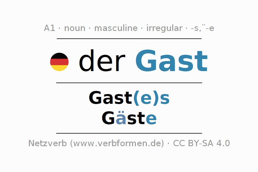 - Singular: der Gast, des Gast(e)s, dem Gast(e), den Gast