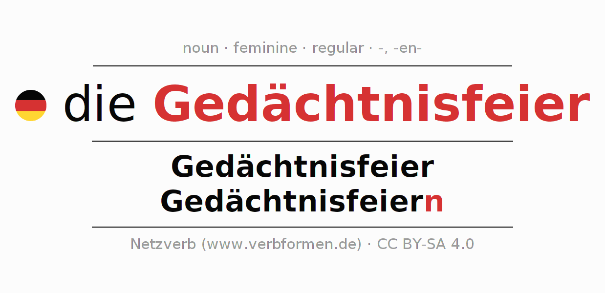 The declension of Gedächtnisfeier as a table with all forms in singular (singular) and plural (plural) and in all four cases nominative (1st case), genitive (2nd case), dative (3rd case) and accusative (4th case). Especially for German learners the correct declension of the word Gedächtnisfeier is crucial.