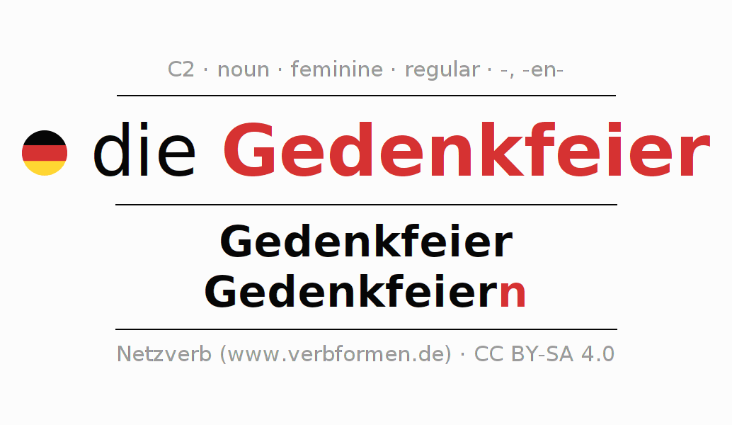 - Singular: die Gedenkfeier, der Gedenkfeier, der Gedenkfeier, die Gedenkfeier