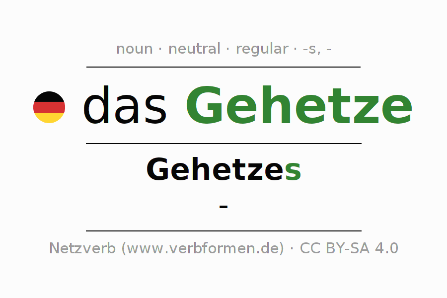 The declension of Gehetze as a table with all forms in singular (singular) and plural (plural) and in all four cases nominative (1st case), genitive (2nd case), dative (3rd case) and accusative (4th case). Especially for German learners the correct declension of the word Gehetze is crucial.