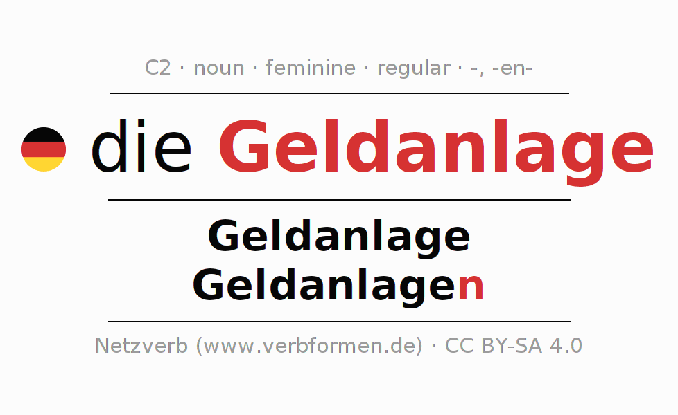 The declension of Geldanlage as a table with all forms in singular (singular) and plural (plural) and in all four cases nominative (1st case), genitive (2nd case), dative (3rd case) and accusative (4th case). Especially for German learners the correct declension of the word Geldanlage is crucial.