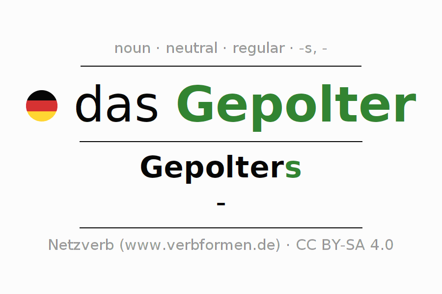 The declension of the noun Gepolter (banging, commotion) is in singular genitive Gepolters and in the plural nominative -. The noun Gepolter is declined with the declension endings s/-. It does not form plurals. The voice of Gepolter is neutral and the article "das". Here you can not only inflect Gepolter but also all German nouns. Comments ☆