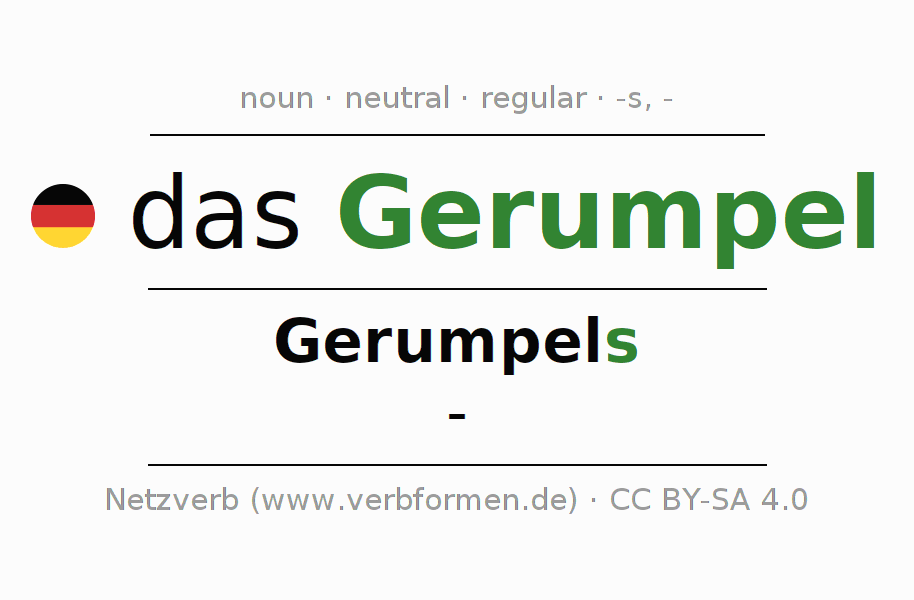 The declension of Gerumpel as a table with all forms in singular (singular) and plural (plural) and in all four cases nominative (1st case), genitive (2nd case), dative (3rd case) and accusative (4th case). Especially for German learners the correct declension of the word Gerumpel is crucial.
