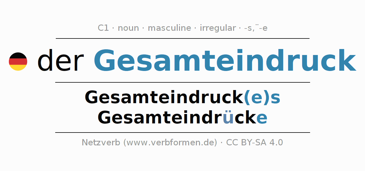 - Singular: der Gesamteindruck, des Gesamteindruck(e)s, dem Gesamteindruck(e), den Gesamteindruck