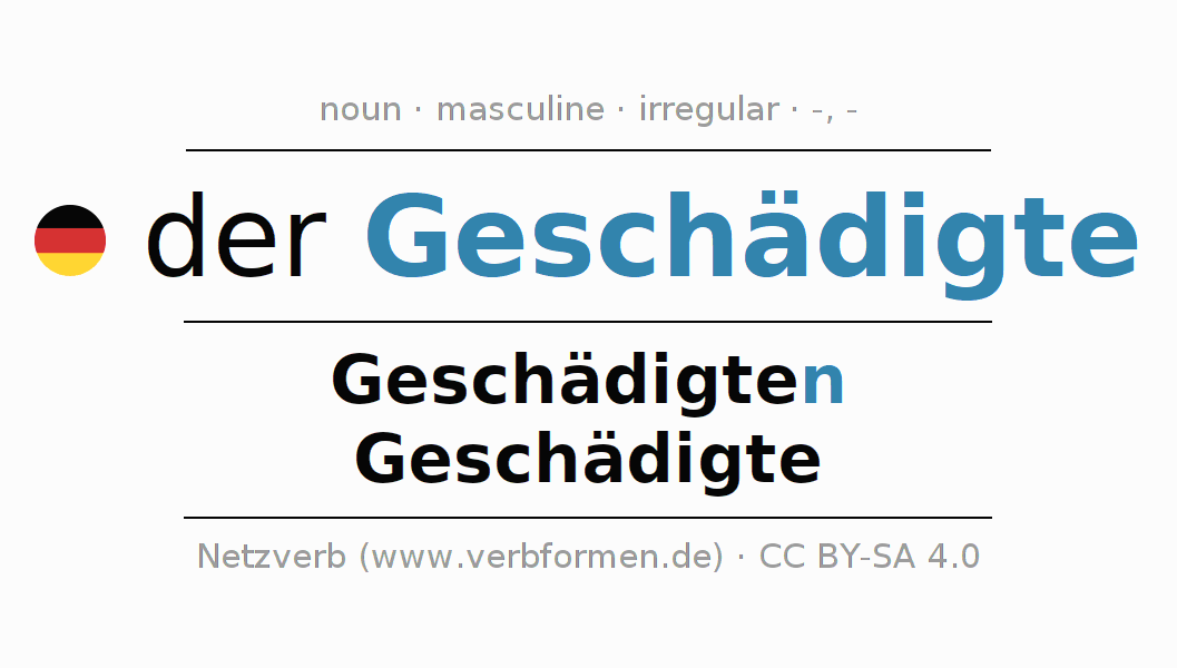 - Singular: der Geschädigte, des Geschädigten, dem Geschädigten, den Geschädigten