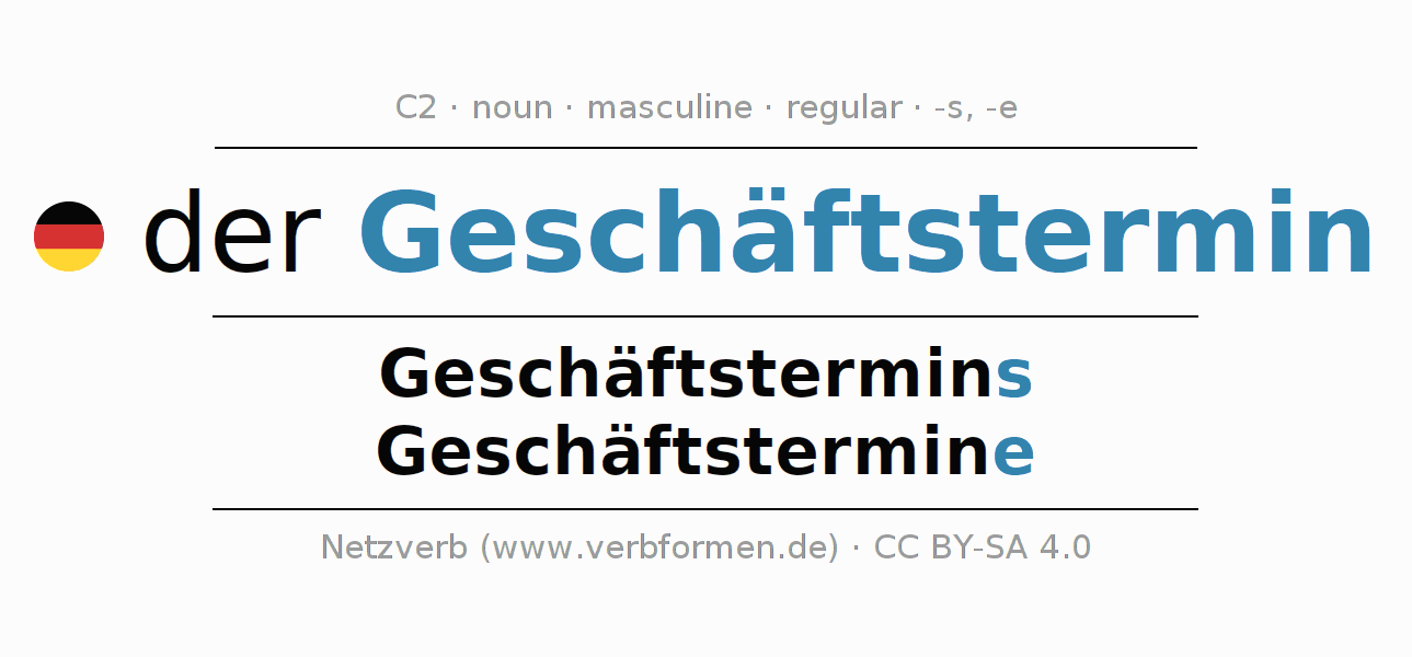 - Singular: der Geschäftstermin, des Geschäftstermins, dem Geschäftstermin, den Geschäftstermin