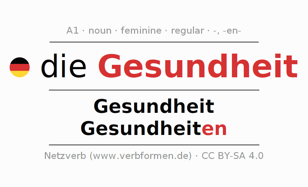 - Plural: die Gesundheiten, der Gesundheiten, den Gesundheiten, die Gesundheiten