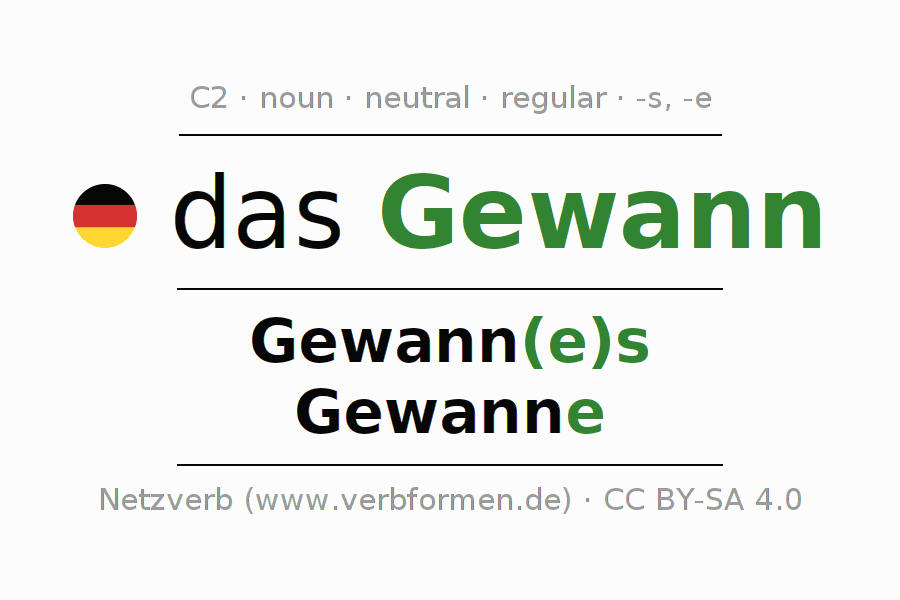 The declension of Gewann as a table with all forms in singular (singular) and plural (plural) and in all four cases nominative (1st case), genitive (2nd case), dative (3rd case) and accusative (4th case). Especially for German learners the correct declension of the word Gewann is crucial.