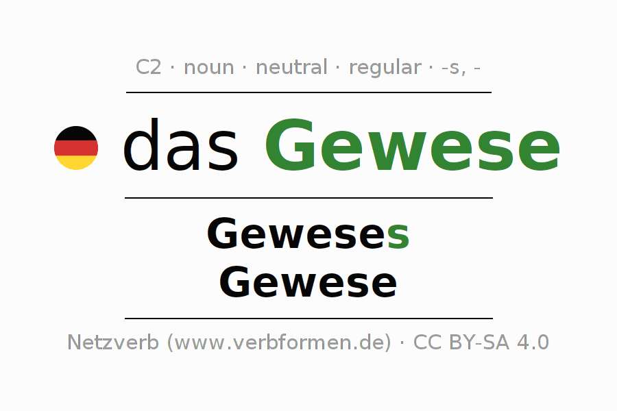 The declension of Gewese as a table with all forms in singular (singular) and plural (plural) and in all four cases nominative (1st case), genitive (2nd case), dative (3rd case) and accusative (4th case). Especially for German learners the correct declension of the word Gewese is crucial.