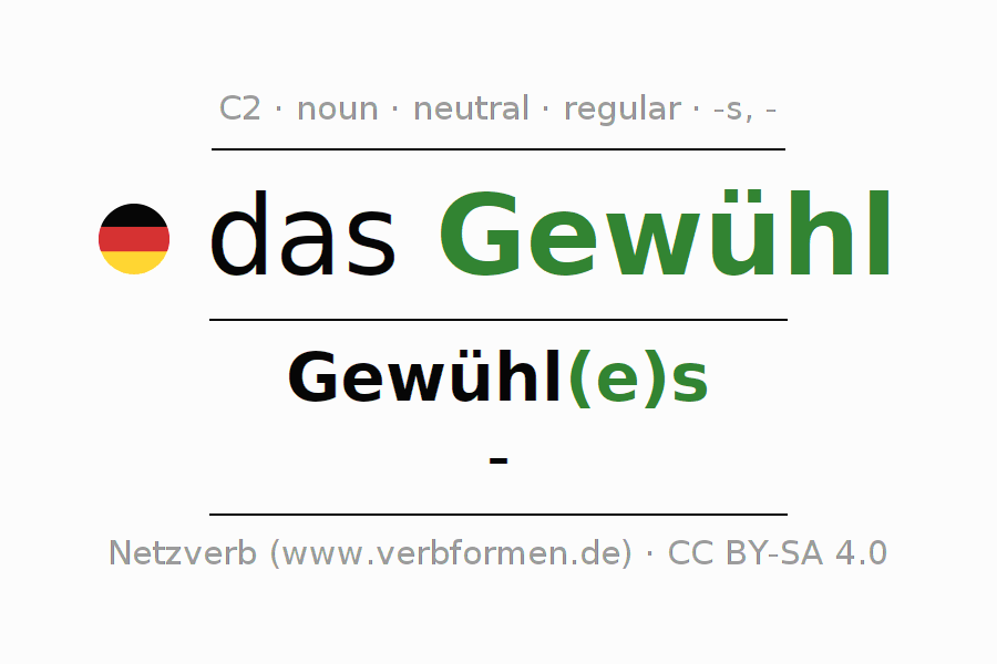 The declension of Gewühl as a table with all forms in singular (singular) and plural (plural) and in all four cases nominative (1st case), genitive (2nd case), dative (3rd case) and accusative (4th case). Especially for German learners the correct declension of the word Gewühl is crucial.