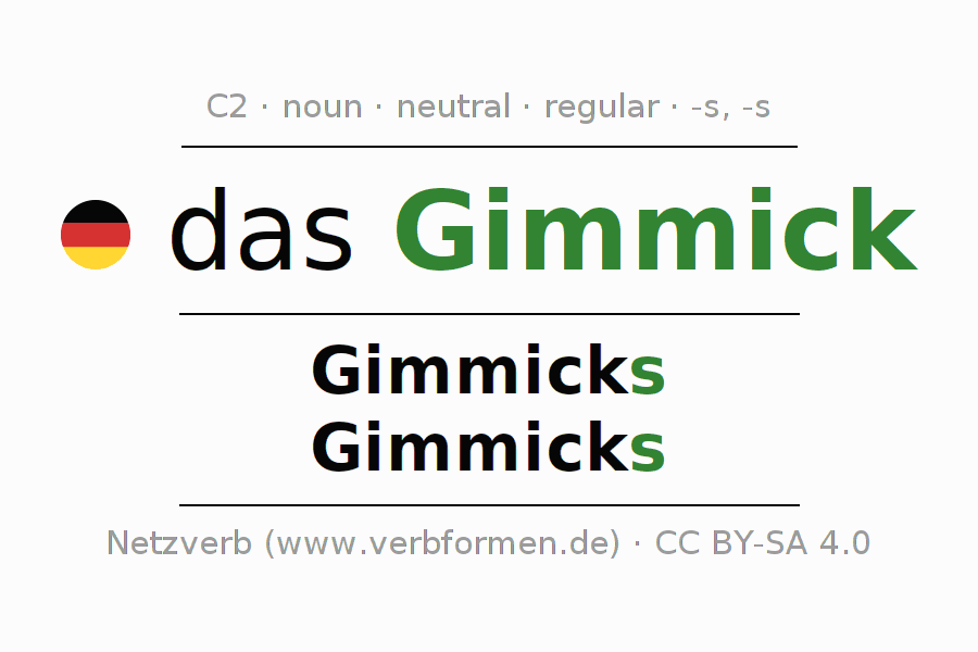 - Singular: das Gimmick, des Gimmicks, dem Gimmick, das Gimmick
