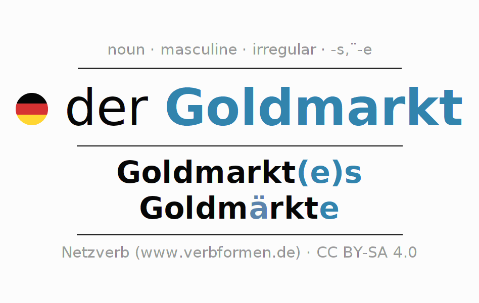 - Singular: der Goldmarkt, des Goldmarkt(e)s, dem Goldmarkt(e), den Goldmarkt