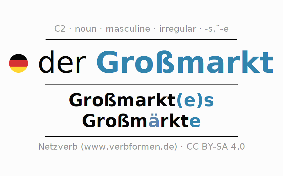 - Plural: die Großmärkte, der Großmärkte, den Großmärkten, die Großmärkte
