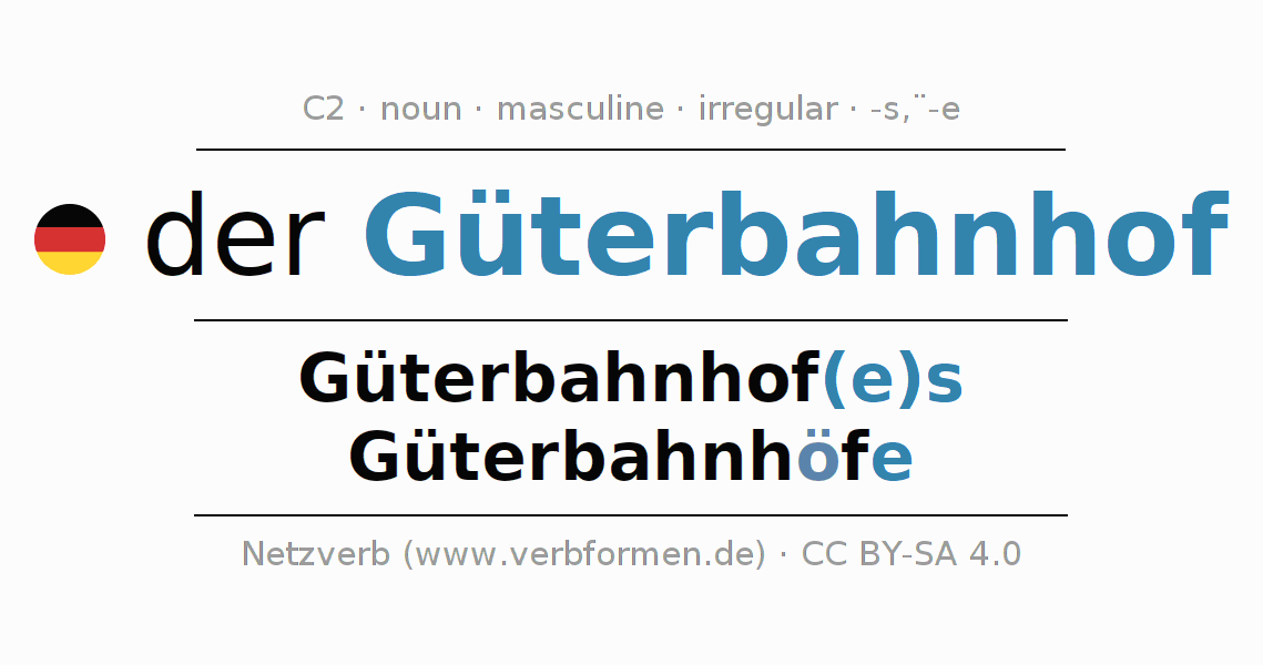 The declension of Güterbahnhof as a table with all forms in singular (singular) and plural (plural) and in all four cases nominative (1st case), genitive (2nd case), dative (3rd case) and accusative (4th case). Especially for German learners the correct declension of the word Güterbahnhof is crucial.