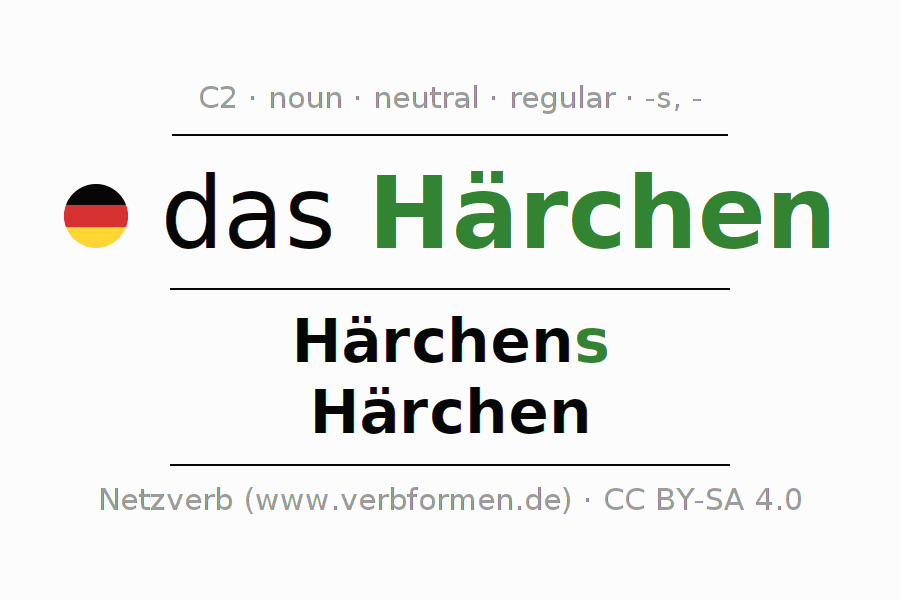 The declension of Härchen as a table with all forms in singular (singular) and plural (plural) and in all four cases nominative (1st case), genitive (2nd case), dative (3rd case) and accusative (4th case). Especially for German learners the correct declension of the word Härchen is crucial.