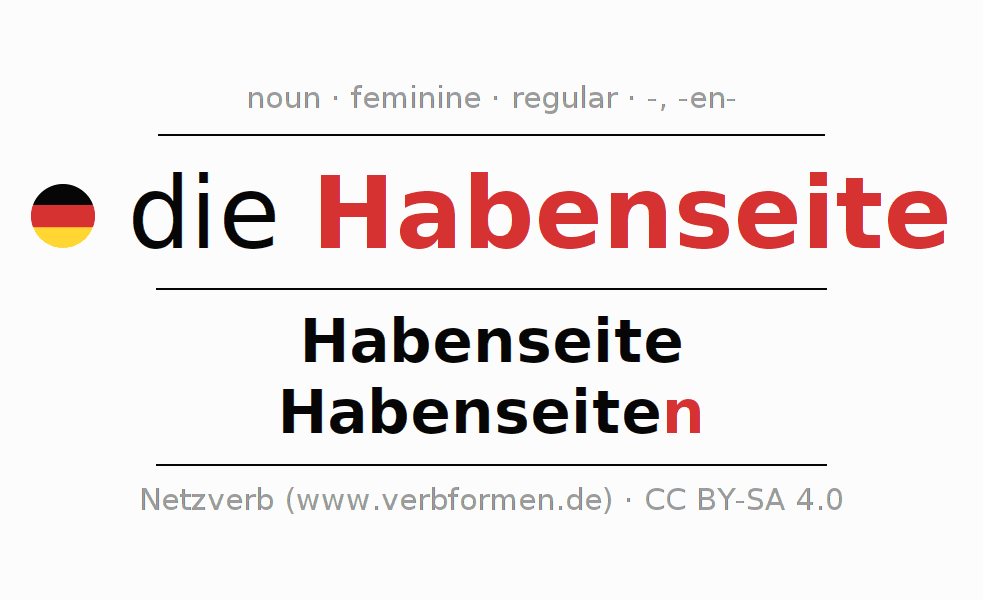 The declension of Habenseite as a table with all forms in singular (singular) and plural (plural) and in all four cases nominative (1st case), genitive (2nd case), dative (3rd case) and accusative (4th case). Especially for German learners the correct declension of the word Habenseite is crucial.