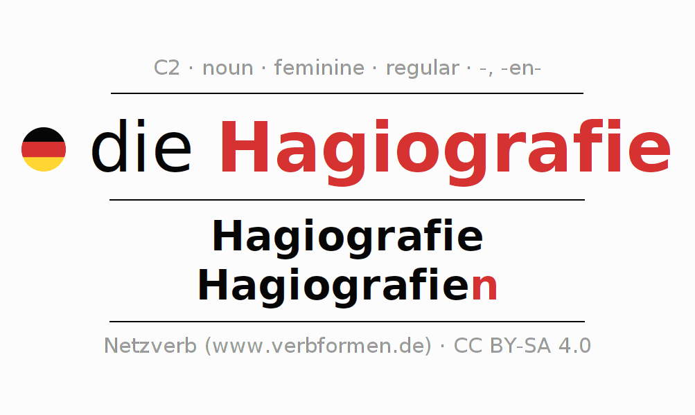 - Singular: die Hagiografie, der Hagiografie, der Hagiografie, die Hagiografie