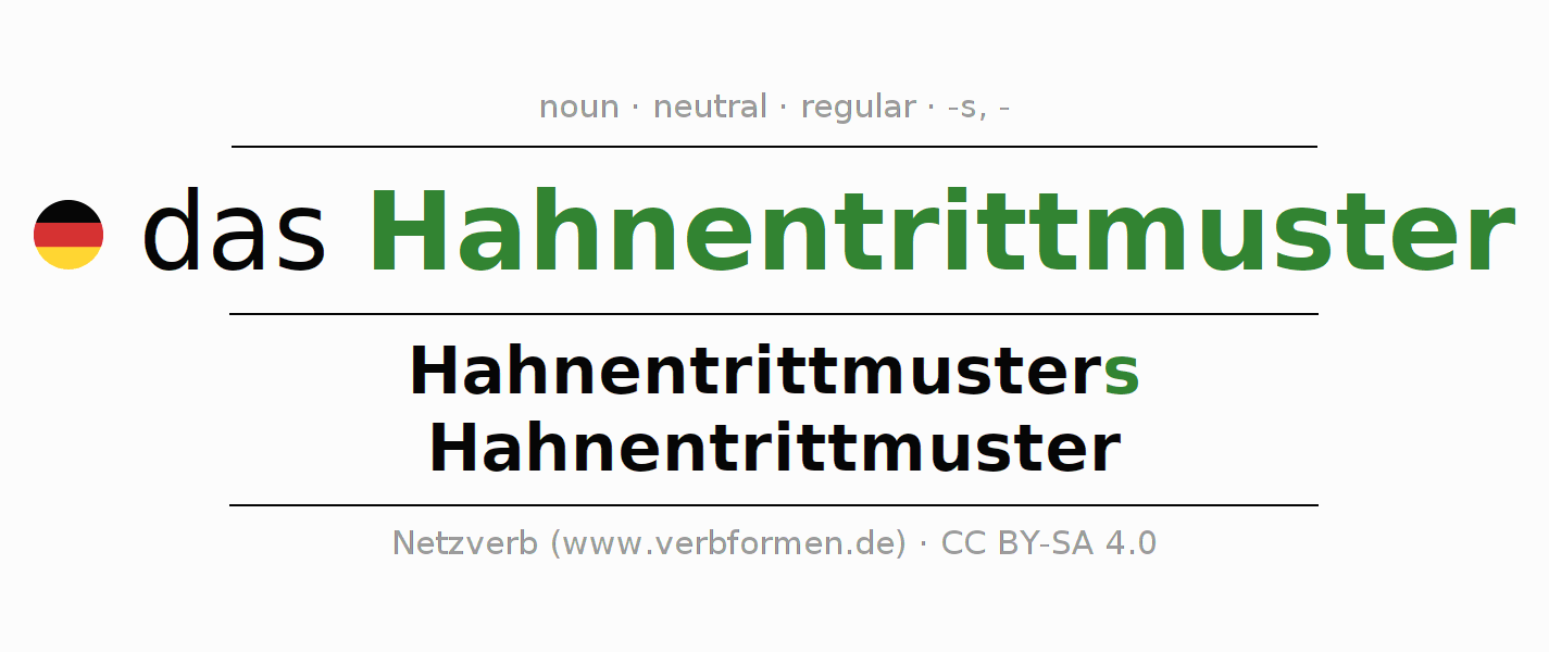 - Singular: das Hahnentrittmuster, des Hahnentrittmusters, dem Hahnentrittmuster, das Hahnentrittmuster