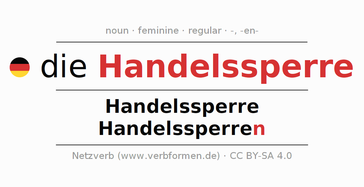 - Plural: die Handelssperren, der Handelssperren, den Handelssperren, die Handelssperren
