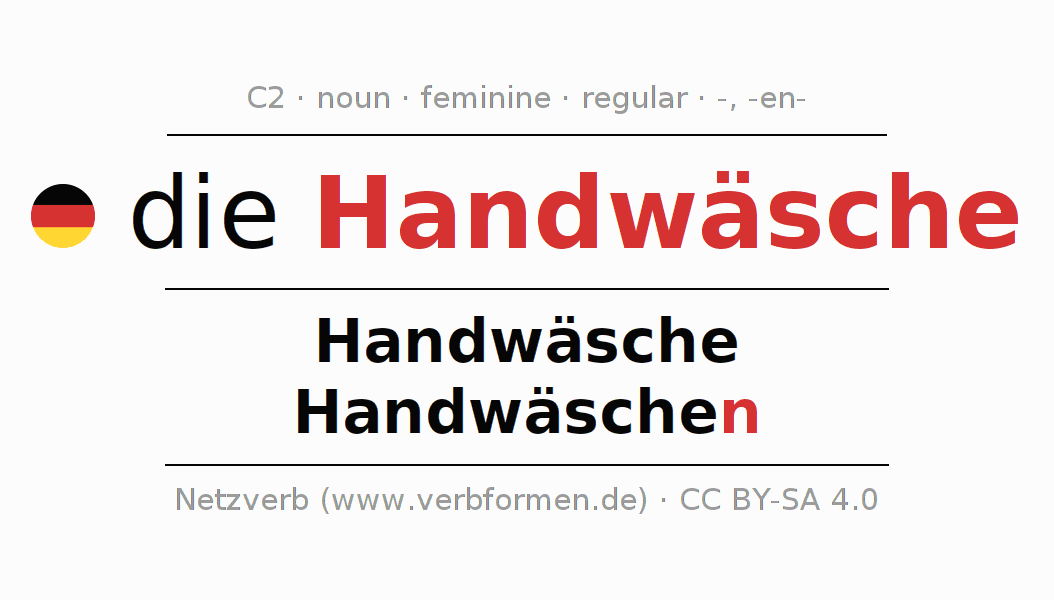 The declension of Handwäsche as a table with all forms in singular (singular) and plural (plural) and in all four cases nominative (1st case), genitive (2nd case), dative (3rd case) and accusative (4th case). Especially for German learners the correct declension of the word Handwäsche is crucial.