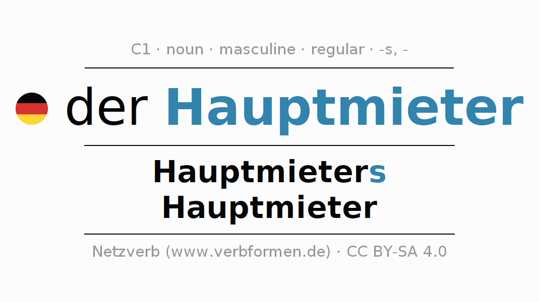 The declension of Hauptmieter as a table with all forms in singular (singular) and plural (plural) and in all four cases nominative (1st case), genitive (2nd case), dative (3rd case) and accusative (4th case). Especially for German learners the correct declension of the word Hauptmieter is crucial.
