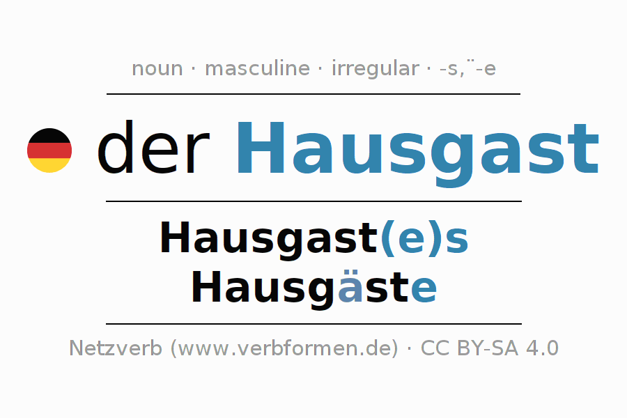 - Singular: der Hausgast, des Hausgast(e)s, dem Hausgast(e), den Hausgast
