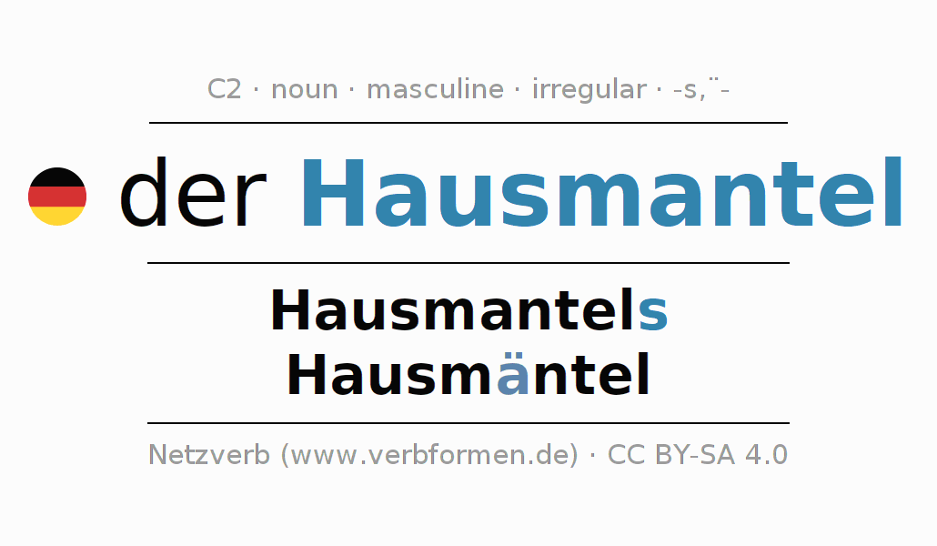 - Singular: der Hausmantel, des Hausmantels, dem Hausmantel, den Hausmantel