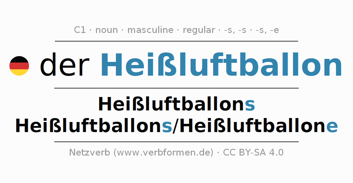 - Singular: der Heißluftballon, des Heißluftballons, dem Heißluftballon, den Heißluftballon