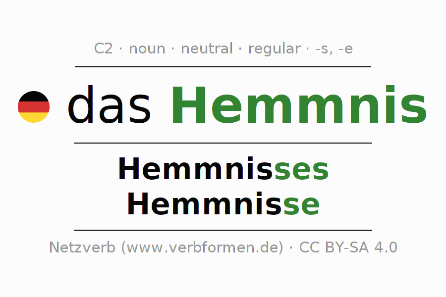 The declension of Hemmnis as a table with all forms in singular (singular) and plural (plural) and in all four cases nominative (1st case), genitive (2nd case), dative (3rd case) and accusative (4th case). Especially for German learners the correct declension of the word Hemmnis is crucial.