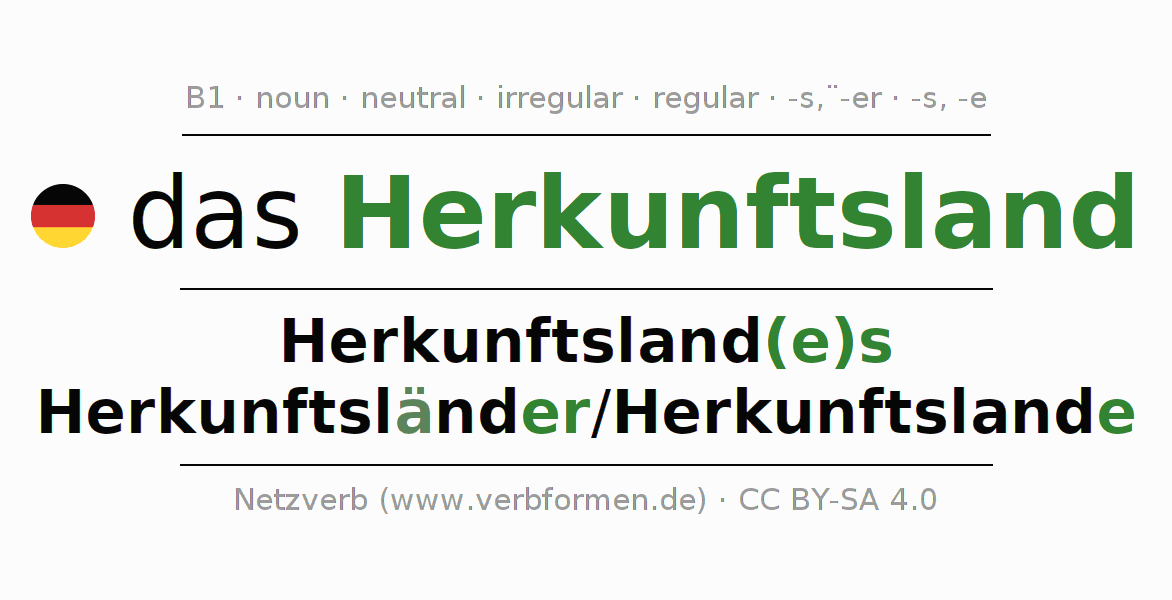 The declension of Herkunftsland as a table with all forms in singular (singular) and plural (plural) and in all four cases nominative (1st case), genitive (2nd case), dative (3rd case) and accusative (4th case). Especially for German learners the correct declension of the word Herkunftsland is crucial.