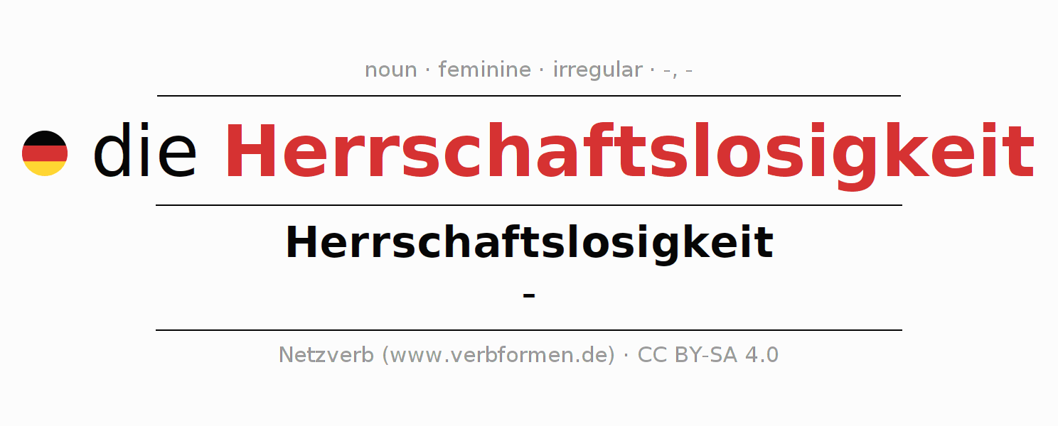 The declension of Herrschaftslosigkeit as a table with all forms in singular (singular) and plural (plural) and in all four cases nominative (1st case), genitive (2nd case), dative (3rd case) and accusative (4th case). Especially for German learners the correct declension of the word Herrschaftslosigkeit is crucial.