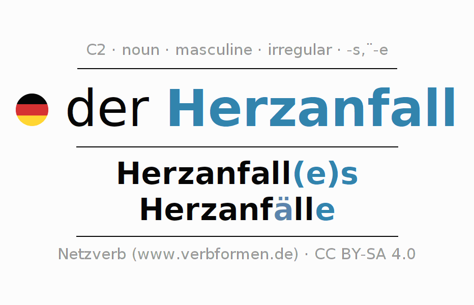The declension of Herzanfall as a table with all forms in singular (singular) and plural (plural) and in all four cases nominative (1st case), genitive (2nd case), dative (3rd case) and accusative (4th case). Especially for German learners the correct declension of the word Herzanfall is crucial.