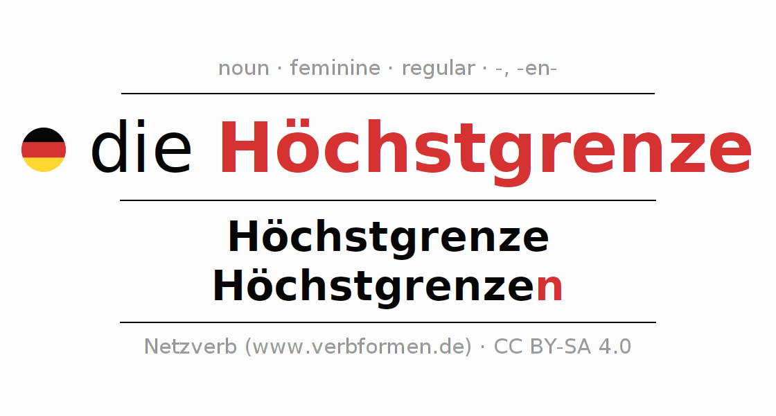 The declension of Höchstgrenze as a table with all forms in singular (singular) and plural (plural) and in all four cases nominative (1st case), genitive (2nd case), dative (3rd case) and accusative (4th case). Especially for German learners the correct declension of the word Höchstgrenze is crucial.