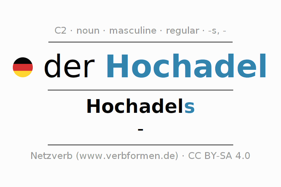 - Singular: der Hochadel, des Hochadels, dem Hochadel, den Hochadel