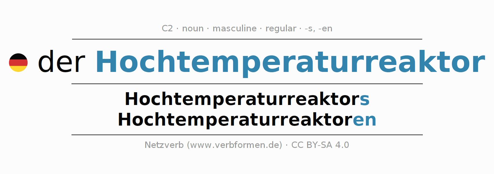 - Singular: der Hochtemperaturreaktor, des Hochtemperaturreaktors, dem Hochtemperaturreaktor, den Hochtemperaturreaktor