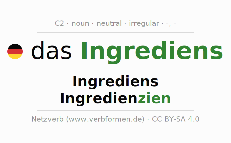 The declension of Ingrediens as a table with all forms in singular (singular) and plural (plural) and in all four cases nominative (1st case), genitive (2nd case), dative (3rd case) and accusative (4th case). Especially for German learners the correct declension of the word Ingrediens is crucial.